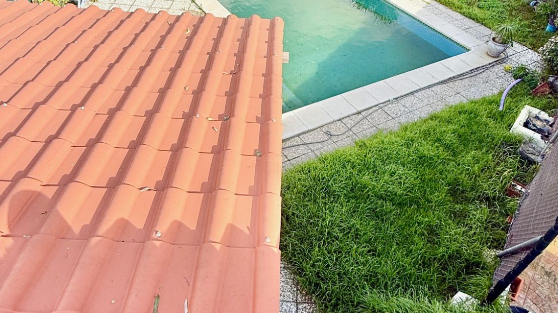 Outside, the garden includes a private swimming pool with plenty of space for sunbathing and relaxation. There is a small storage room at the entrance to the plot, ideal for garden equipment or general storage. A roof terrace, accessed by an external staircase at the rear of the property, provides additional outdoor space. Off-road parking is available for two to three vehicles.