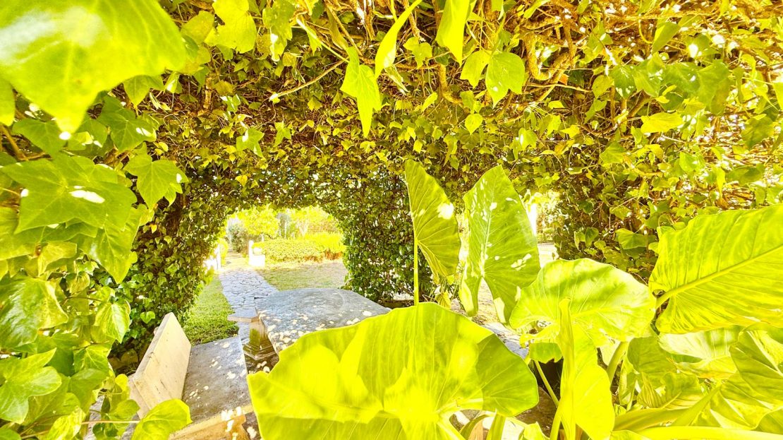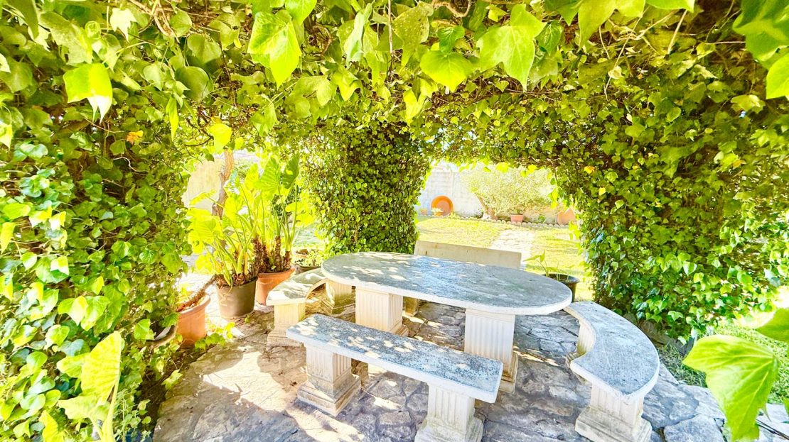 Outside, the property truly shines. The garden is a peaceful haven filled with mature trees, shrubs, and lush greenery, creating a private and calming environment. A charming outdoor dining area sits beneath a beautiful natural ivy canopy, offering cool shade — the perfect spot for long, relaxed meals or quiet afternoons.